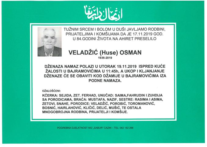 Tužnim srcem i bolom u duši javljamo rodbini, prijateljima i komšijama da je 17.11.2019 god. u 84. godini života na Ahiret preselio Veladžić (Huse) Osman.