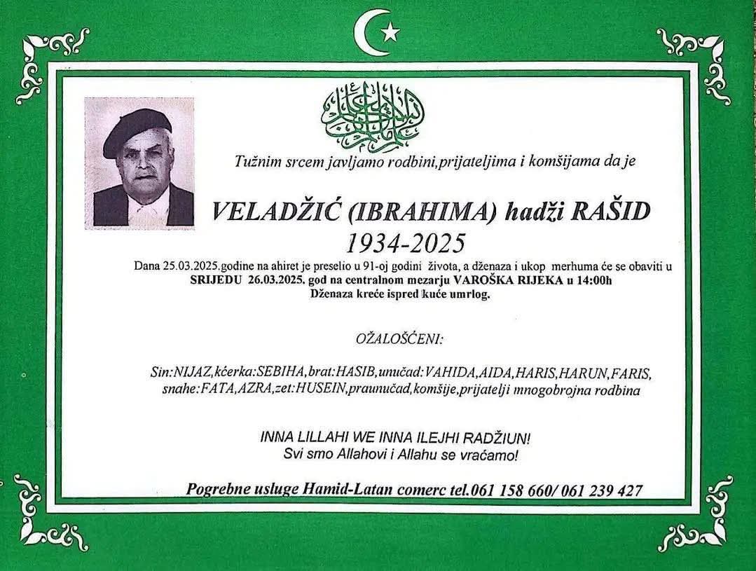Dana 25.03.2025.godine na ahiret je preselio u 91-oj godini života, a dženaza i ukop merhuma će se obaviti u SRIJEDU 26.03.2025.god na centralnom mezarju VAROŠKA RIJEKA u 14:00h. Dženaza kreće ispred kuće umrlog.