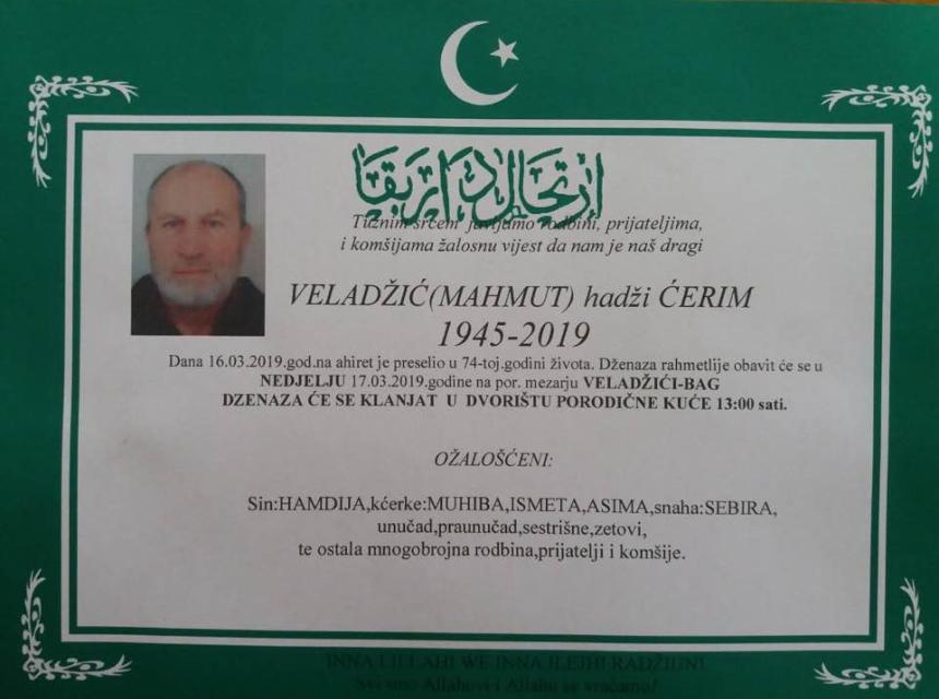 Obavještavamo rodbinu, komšije i prijatelje da je 13.03.2019. u 74-oj godini života na Ahiret preselio Veladžić (Mahmut) hadži Ćerim.