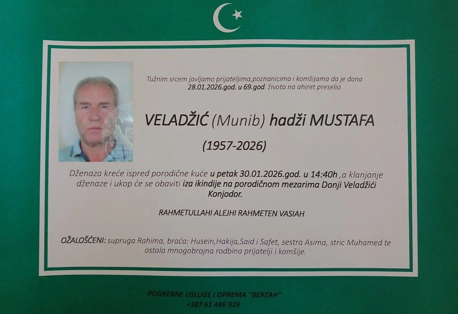 Dženaza kreće ispred porodične kuće u petak 30.01.2026.god. u 14:40h,a klanjanje dženaze i ukop će se obaviti iza ikindije na porodičnom mezarima Donji Veladžići Konjodor.