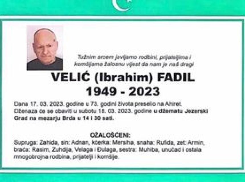 Tužnim srcem i bolom u duši javljamo rodbini, prijateljima i komšijama da je naš dragi Velić (Ibrahim) Fadil dana 17.03.2023. godine u 73-oj godini života, preselio na Ahiret.
