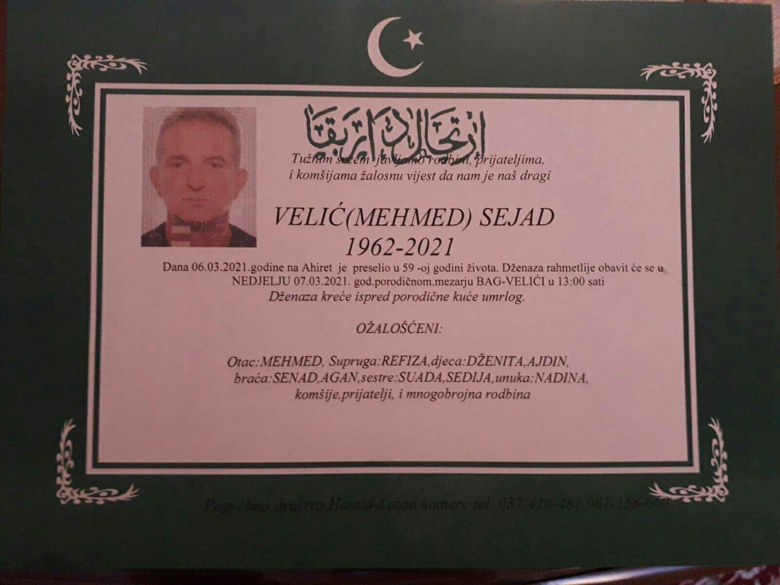 Tužnog srca i s bolom u duši obavještavamo rodbinu, komšije i prijatelje da je naš dragi Velić (Mehmed) Sejad 06.03.2021. godine, u 59. godini života preselio na Ahiret.