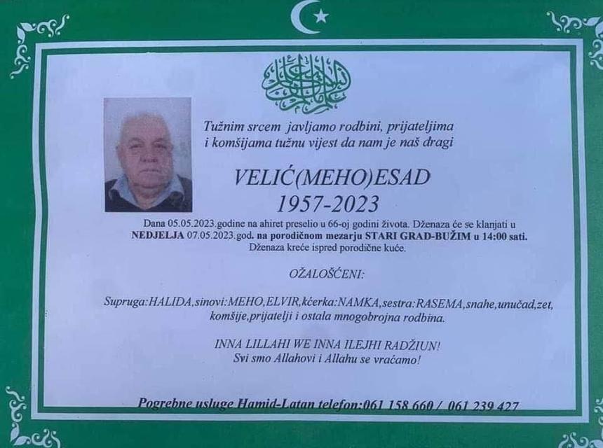 Obavještavamo rodbinu, prijatelje i komšije da je dana 05.05.2023. godine u 66-oj godini života na Ahiret preselio Velić (Meho) Esad.