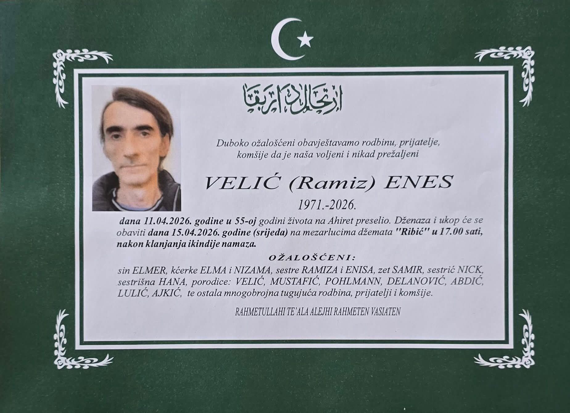 Dženaza i ukop će se obaviti dana 15.04.2026. godine (srijeda) na mezarlucima džemata “Ribić” u 17:00 sati, nakon klanjanja ikindije-namaza.