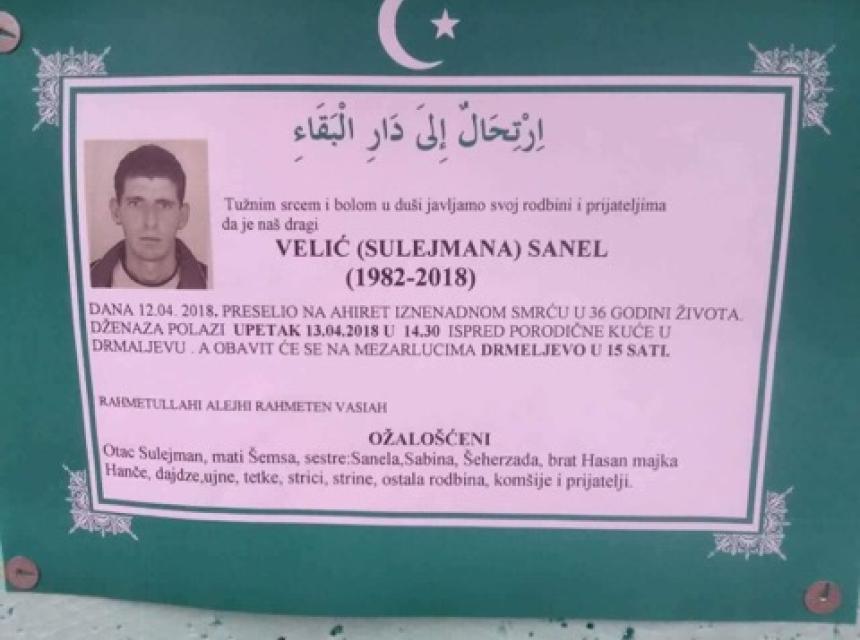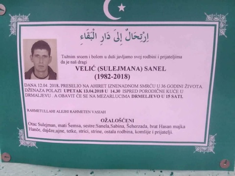 Tužnim srcem i bolom u duši obavještavamo rodbinu, prijatelje i komšije da je naš dragi Velić (Sulejmana) Sanel iznenadnom smrću preselio na Ahiret 12.04.2018. godine u 36-oj godini života.