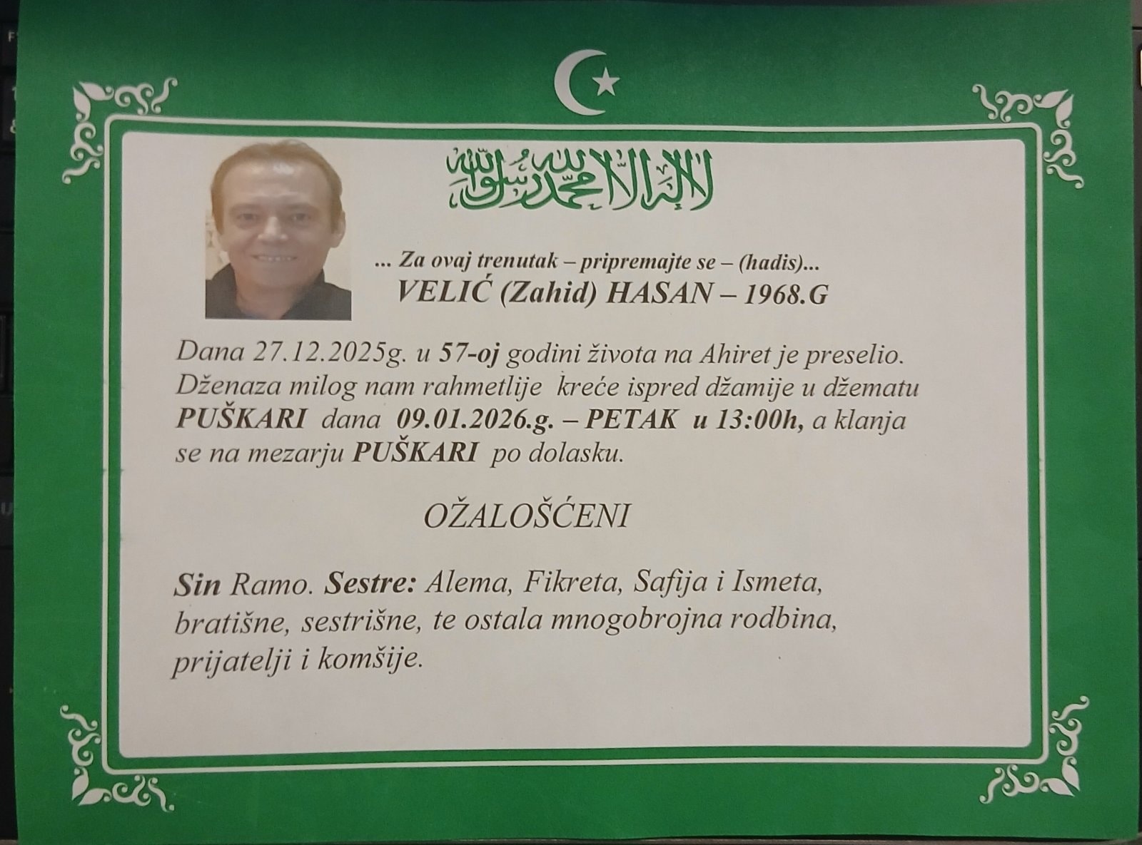 Obavještavamo rodbinu, prijatelje i poznanike da je u nedjelju 27.12.2025. godine, u 57. godini, na ahiret preselio Velić (Zahid) Hasan.