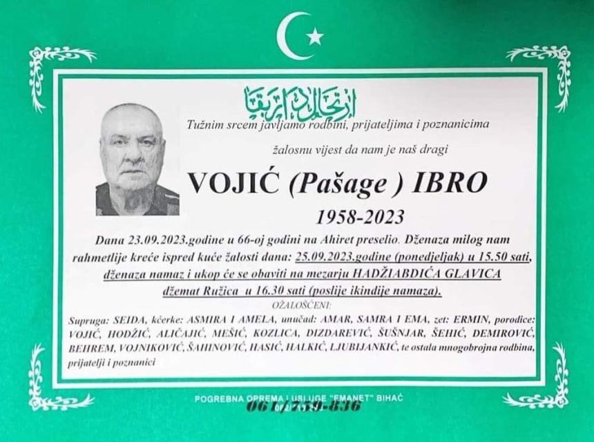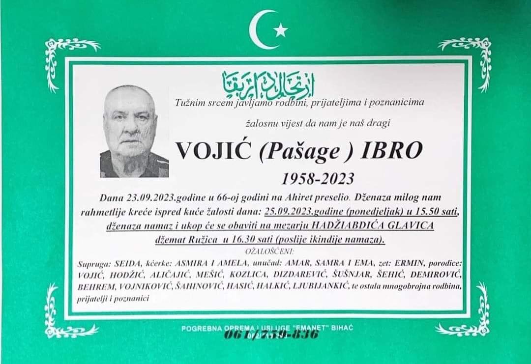 Tužnim srcem i bolom u duši javljamo rodbini, prijateljima i komšijama da je naš dragi Vojić (Pašage) Ibro, dana 23.09.2023. godine u 66-oj godini života, preselio na Ahiret.