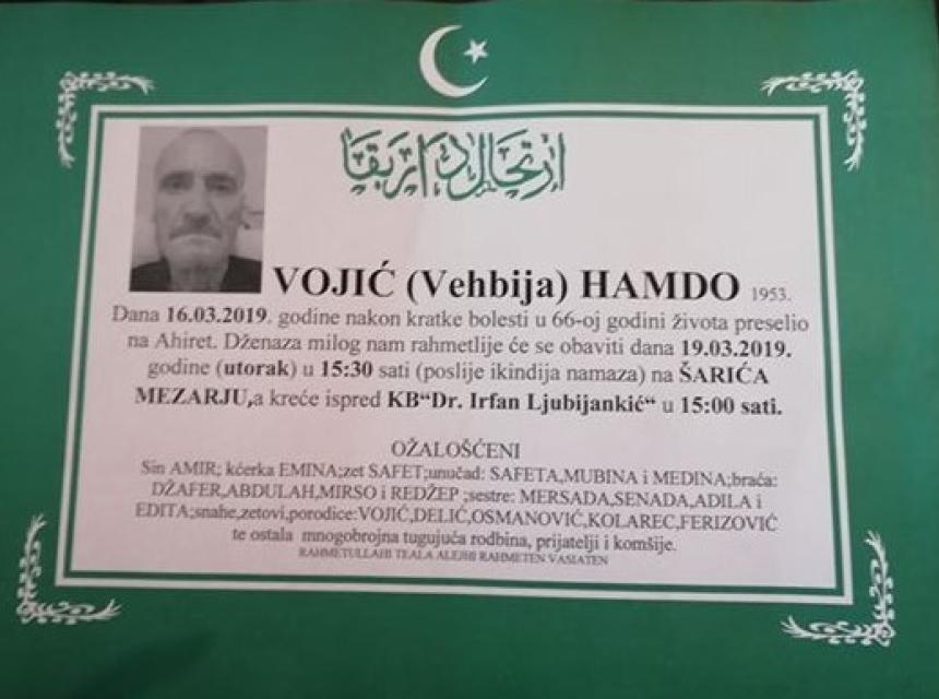 Obavještavamo rodbinu, komšije i prijatelje da je 16.03.2019. u 66-oj godini života na Ahiret preselio Vojić (Vehbija) Hamdo.
