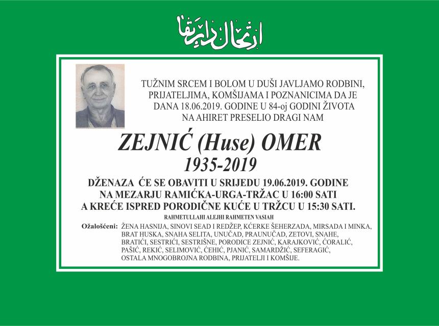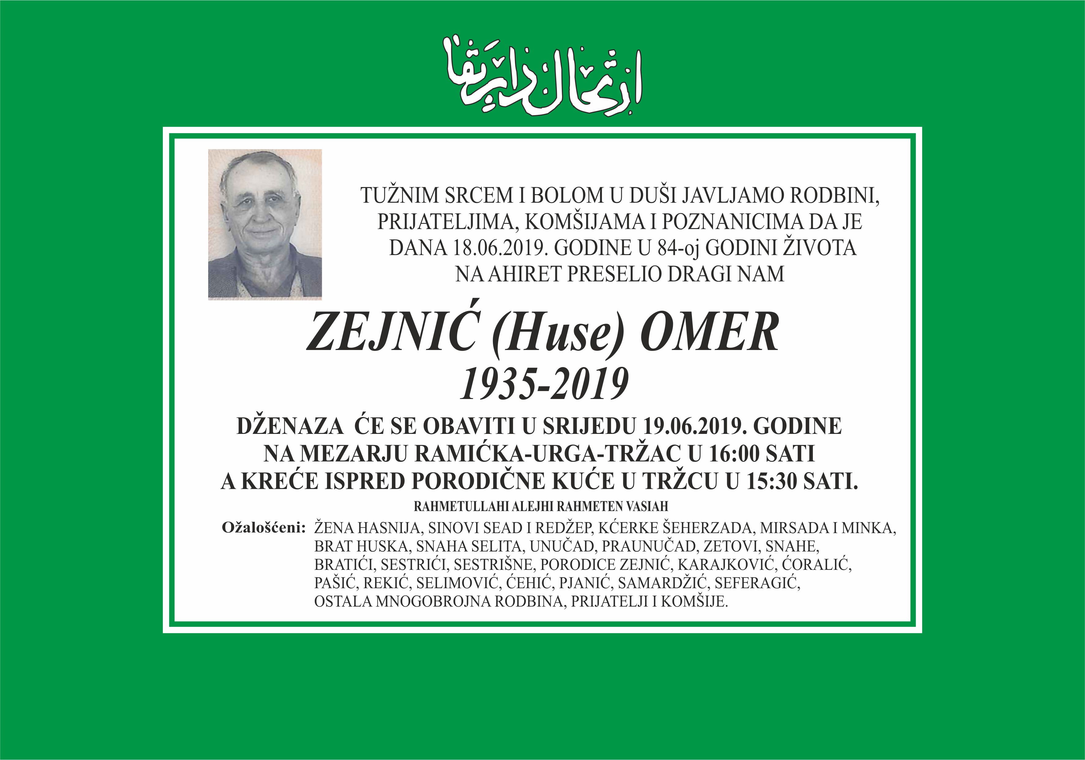 Tužnim srcem i bolom u duši javljamo rodbini, prijateljima, komšijama i poznanicima da je dana 18.06.2019. godine u 84-oj godini života na ahiret preselio dragi nam Zejnić (Huse) Omer.