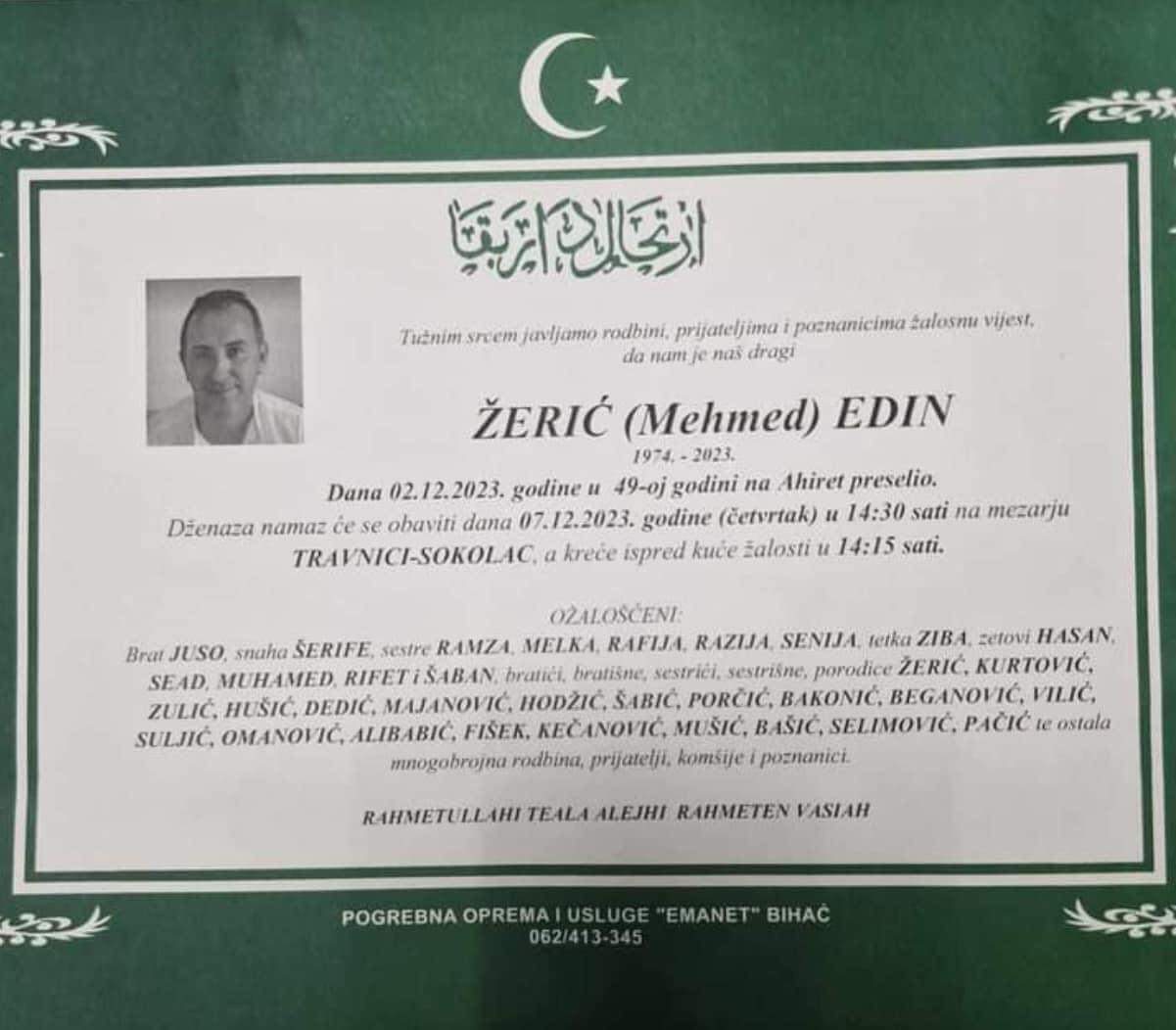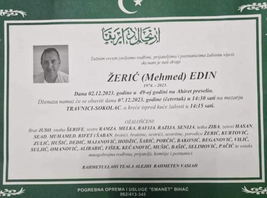 TUŽNIM SRCEM I BOLOM U DUŠI JAVLJAMO RODBINI, PRIJATELJIMA I POZNANICIMA DA JE NAŠ DRAGI Žerić (Mehmed) Edin , dana 02.12.2023. godine, a u 49-oj godini preselio na ahiret.