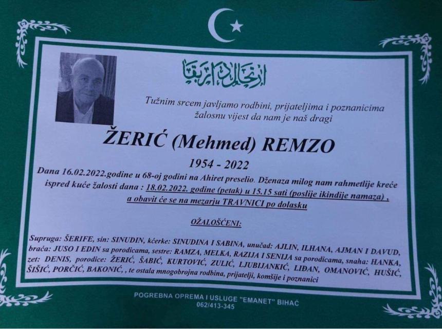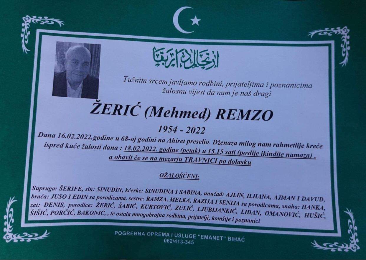 Tužnog srca i s bolom u duši obavještavamo rodbinu, komšije i prijatelje da je naš dragi Žerić (Mehmed) Remzo 16.02.2022. u 68. godini života preselio na ahiret.