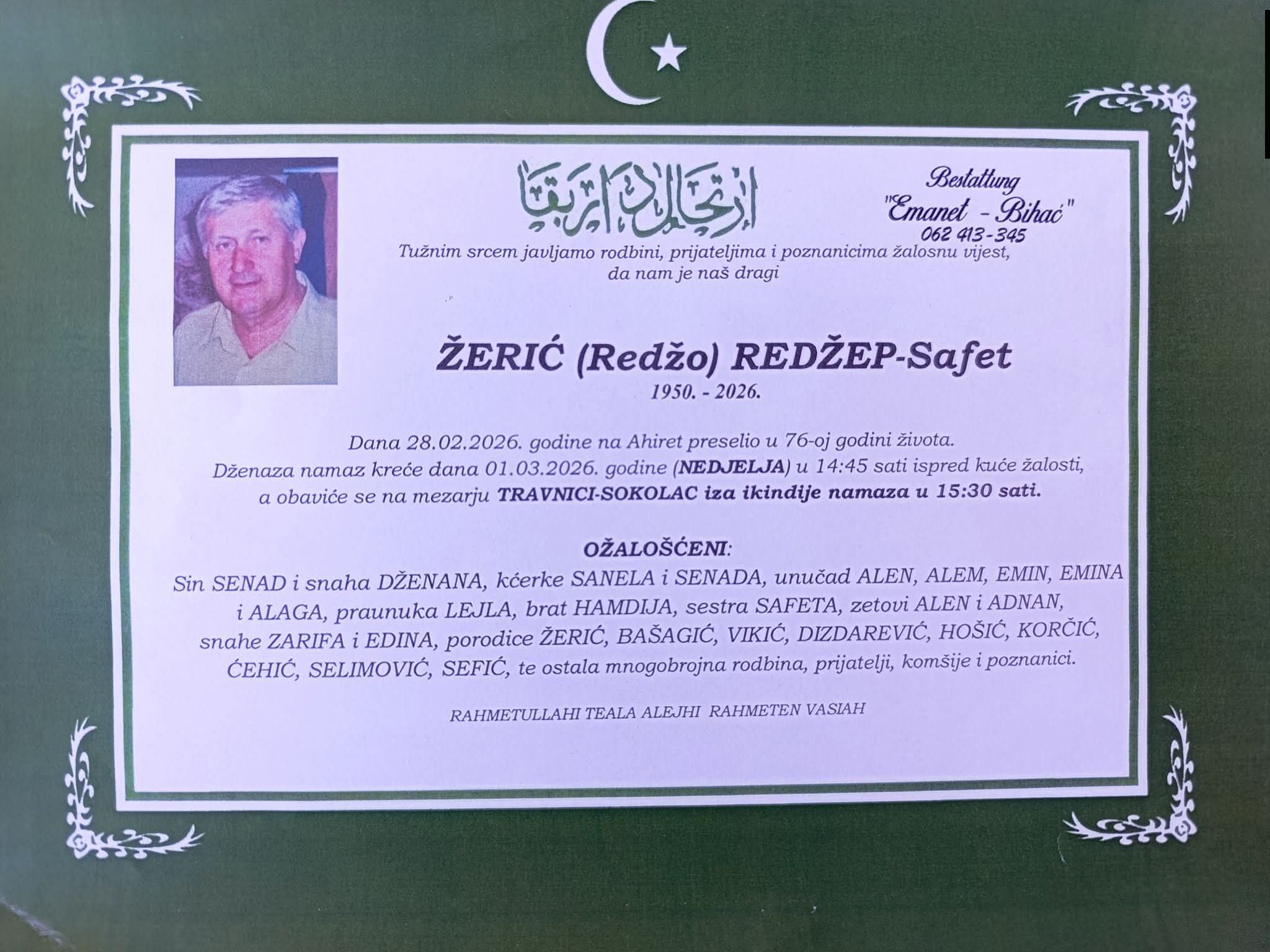 Tužnim srcem javljamo rodbini, prijateljima i poznanicima žalosnu vijest, da nam je naš dragi ŽERIĆ (Redžo) REDŽEP-Safet dana 28.02.2026. godine na Ahiret preselio u 76-oj godini života.