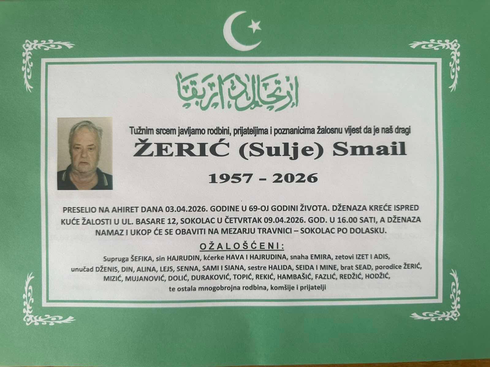 DŽENAZA KREĆE ISPRED KUĆE ŽALOSTI U UL. BASARE 12, SOKOLAC U ČETVRTAK 09.04.2026. GOD. U 16.00 SATI, A DŽENAZA NAMAZI UKOP ĆE SE OBAVITI NA MEZARJU TRAVNICI - SOKOLAC PO DOLASKU.