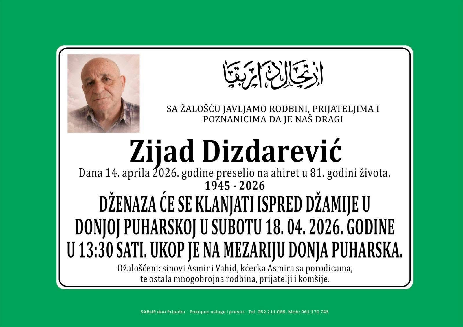 Dženaza će se klanjati ispred džamije u Donjoj Puharskoj u subotu, 18.04.2026. godine u 13:30 sati.