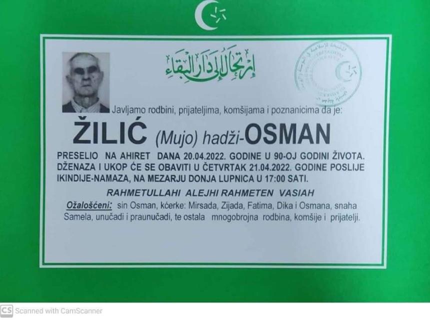 Tužnog srca i s bolom u duši obavještavamo rodbinu, komšije i prijatelje da je naš dragi Žilić (Mujo) hadži- Osman u 90. godini života preselio na Ahiret.