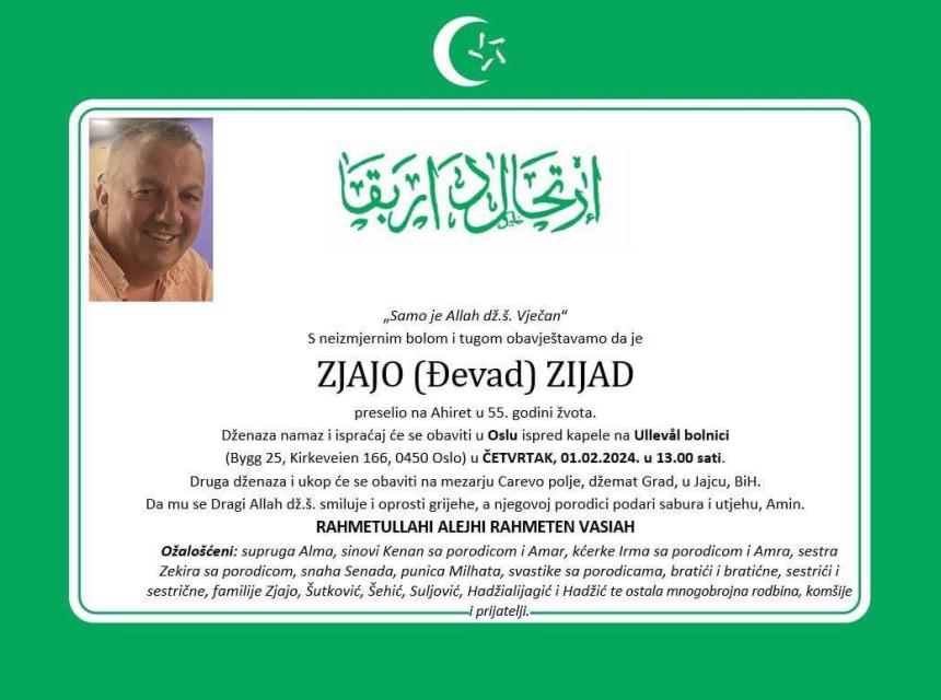 Dženaza namaz i ispraćaj će se obaviti u Oslu ispred kapele na Ullevål bolnici u četvrtak, 01.02.2024. godine u 13:00h. Druga dženaza i ukop će se obaviti na mezarju Carevo polje, džemat Grad, u Jajcu, BiH.