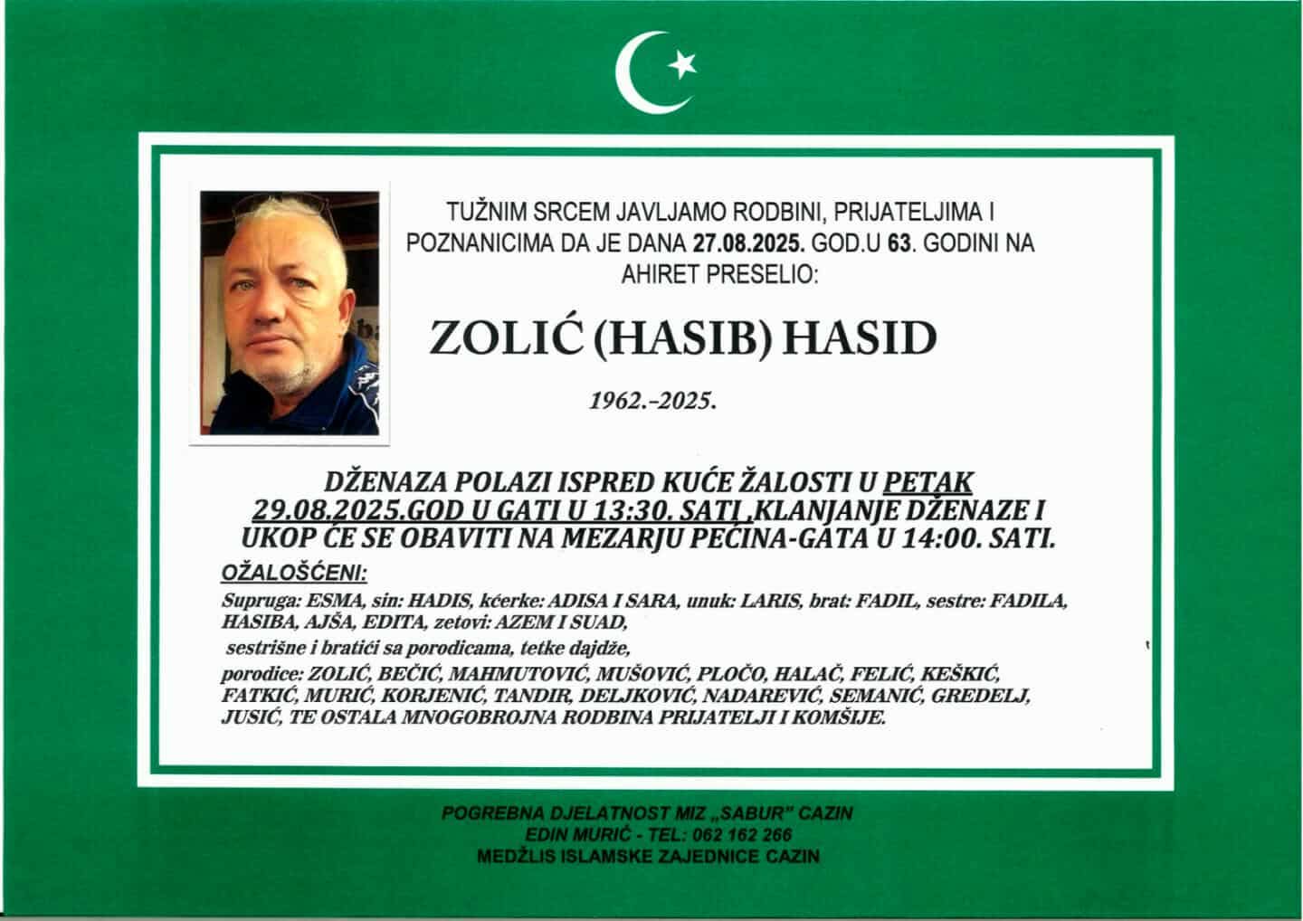 Dženaza polazi ispred kuće žalosti u petak, 29.08.2025. godine u Gati u 13:30 sati.