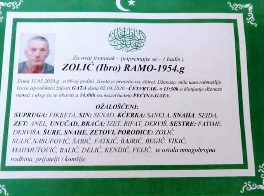 Teškim srcem i bolom u duši javljamo da je naš dragi i nikad prežaljeni Zolić (Ibro) Ramo dana 31.03.2020.godine u 66-toj godini života preselio na Ahiret.
