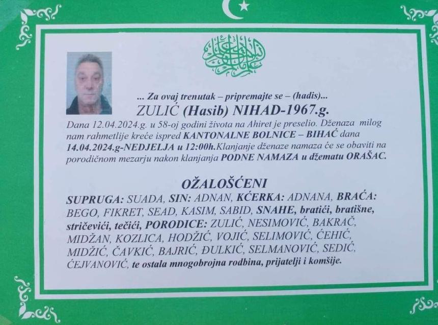 Obavještavamo rodbinu, prijatelje, poznanike i komšije da je dana 12.04.2024. god. 58-oj.godini života na Ahiret preselio naš dragi Zulić (Hasib) Nihad.