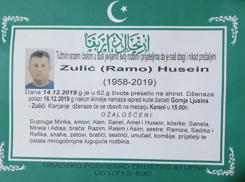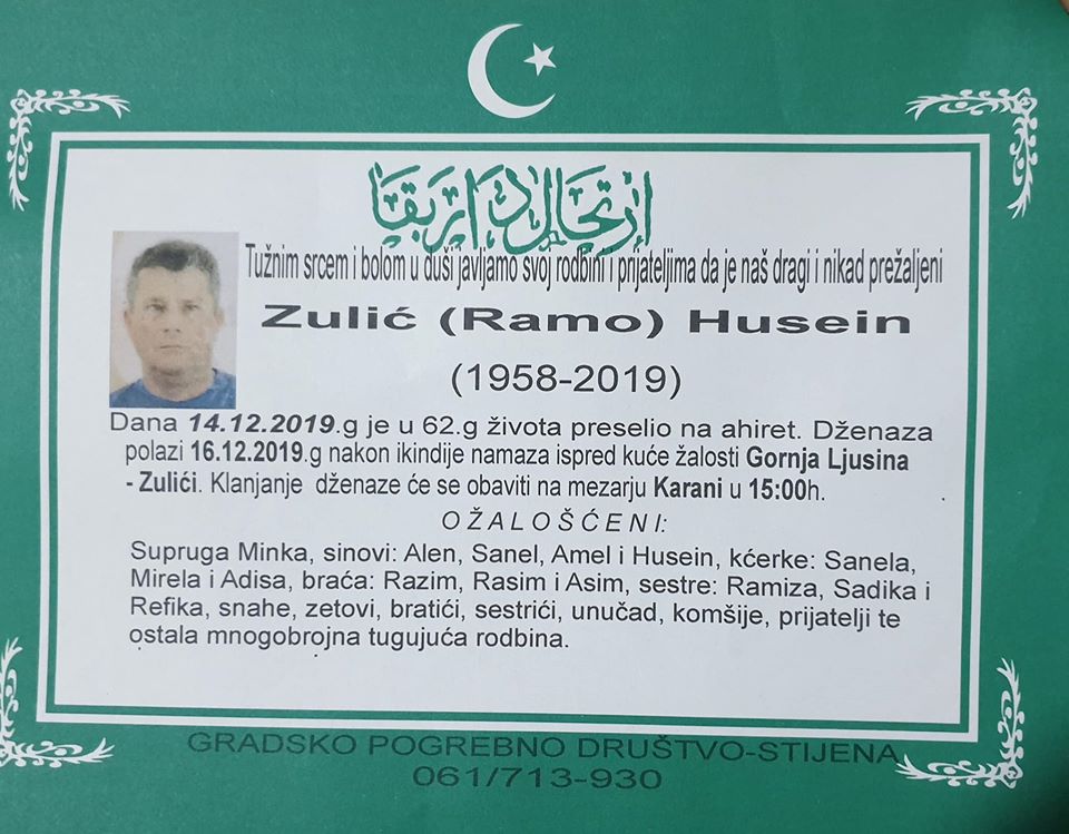 Tužnim srcem i bolom u duši javljamo rodbini i prijateljima da je dana 14.12.2019. godine u 62-oj godini života, na Ahiret preselio Zulić (Ramo) Husein. Dženaza polazi 16.12.2019. godine, nakon ikindije namaza, ispred kuće žalosti Gornja Ljusina-Zulići. Dženaza će se obaviti na mezarju KARANI u 15:00 h.
