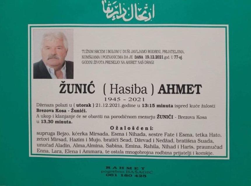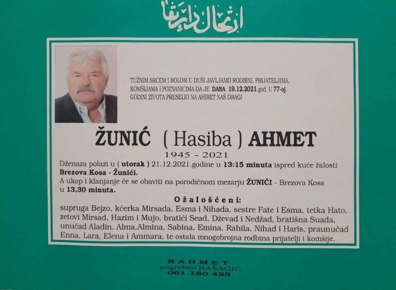 Tužnog srca i s bolom u duši obavještavamo rodbinu, komšije i prijatelje da je naš dragi Žunić (Hasiba) Ahmet, dana 19.12.2021. godine, u 77-oj godini života, preselio na Ahiret.
