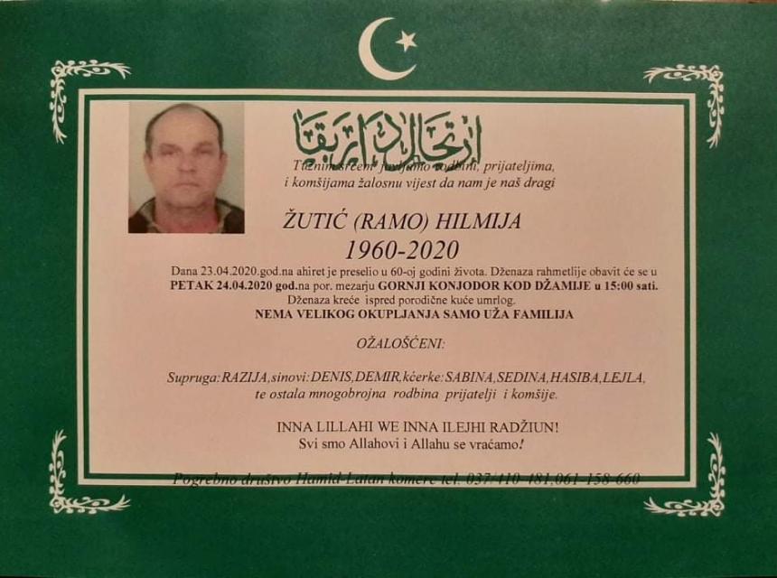Teškim srcem i bolom u duši javljamo da je naš dragi i nikad prežaljeni Žutić (Ramo) Hilmija dana 23.04.2020.godine u 60-oj godini života preselio na Ahiret.