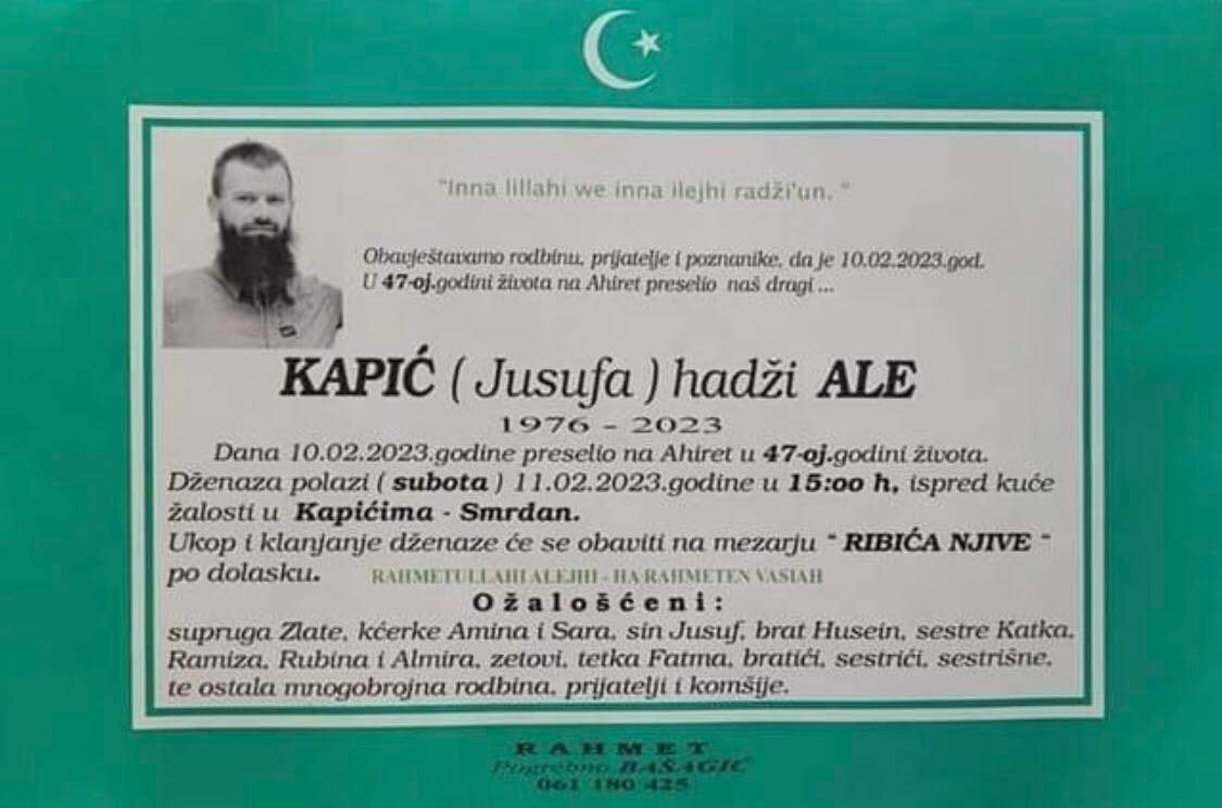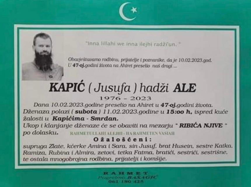 Obavještavamo rodbinu, prijatelje i poznanike da je dana 10.02.2023. godine u 47-oj godini života na Ahiret preselio naš dragi Kapić (Jusufa) hadži Ale.