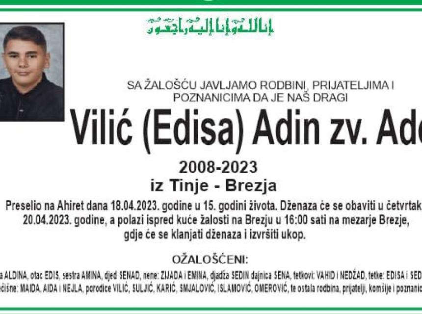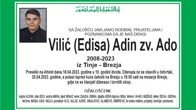 Tužnim srcem i bolom u duši javljamo rodbini, prijateljima i komšijama da je naš dragi Vilić (Edisa) Adin zv. Ado dana 18.04.2023. godine u 15-oj godini života preselio na Ahiret.