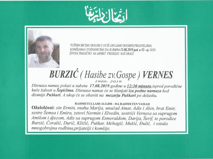 Tužnim srcem i bolom u duši javljamo rodbini, prijateljima, komšijama i poznanicima da je dana 15.08.2019. godine u 52-oj godini života tragično na Ahiret preselio naš dragi Burzić (Hasibe zv. Gospe) Vernes.