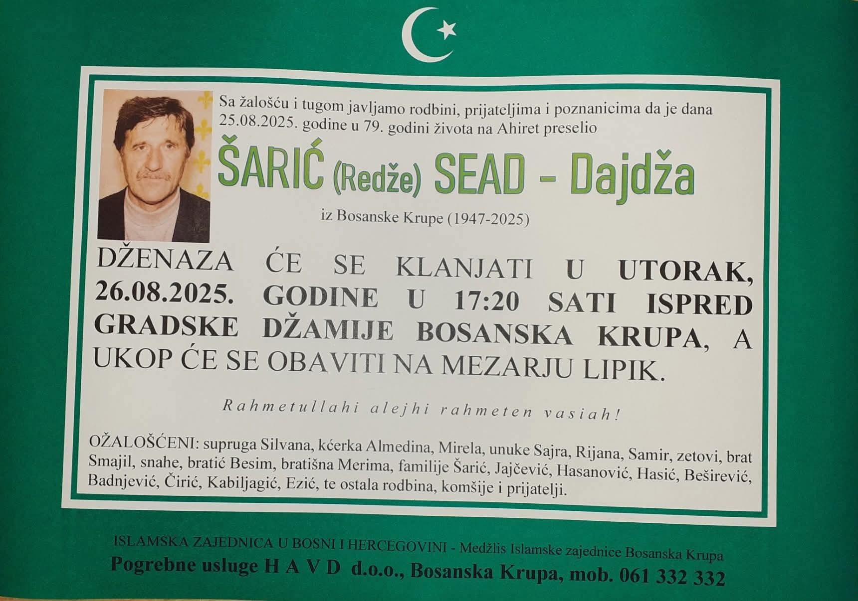 Dženaza će se klanjati u utorak, 26.08.2025. godine u 17:20 sati ispred Gradske džamije Bosanska Krupa, a ukop će se obaviti na mezarju Lipik.