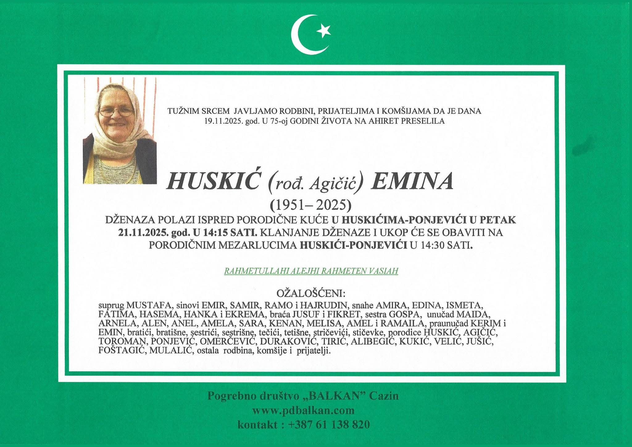 Dženaza polazi ispred porodične kuće u Huskićima – Ponjevići u petak, 21.11.2025. godine u 14:15 sati. Klanjanje dženaze i ukop obavit će se na
