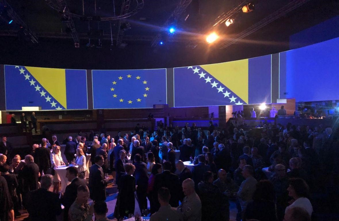U prostoru okićenom bojama EU, koje su ujedno i boje BiH, program je započeo intoniranjem himni Bosne i Hercegovine i Europske unije.