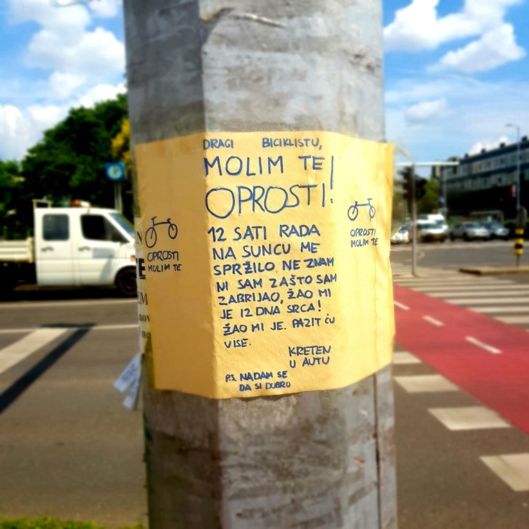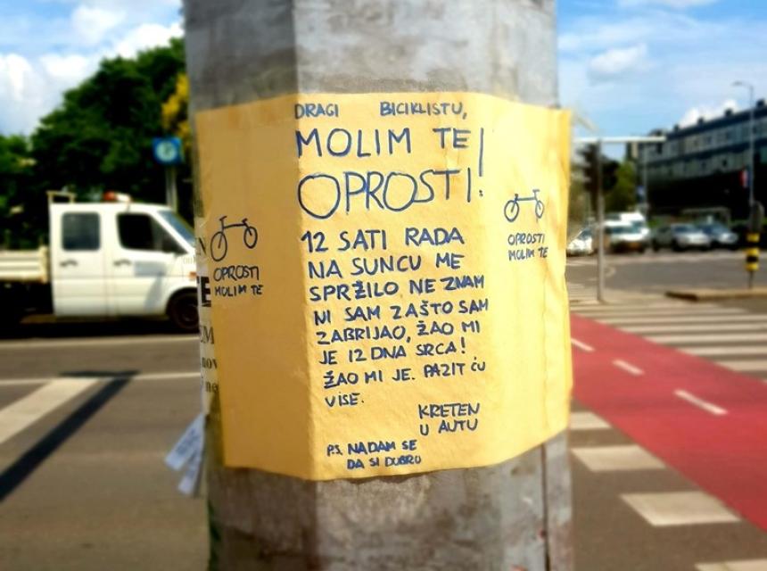 Na križanju Miramarske i Vukovarske ulice u Zagrebu osvanula je poruka jednog vozača kojemu je žao zbog ponašanja u prometu prema jednom biciklistu. Vozač je poruku napisao rukom na žutom papiru i zalijepio je na stup.