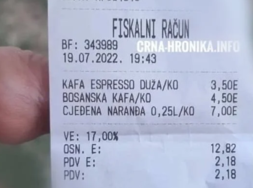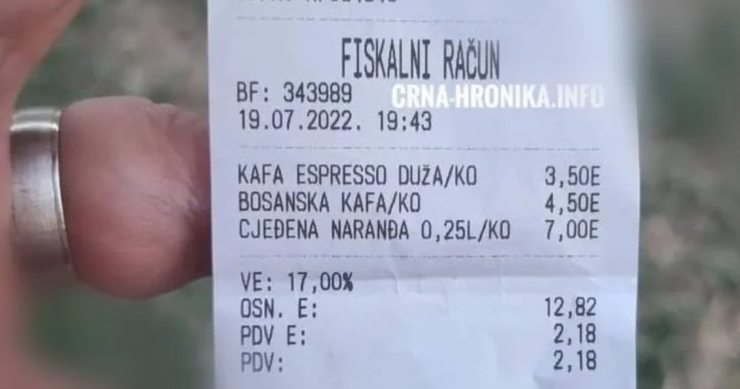 Portal Crna hronika je objavio račun iz jednog restorana na Trebeviću. Gosti su naručili dvije espresso kafe i jednu cijeđenu narandžu, a račun je bio 15 KM.
