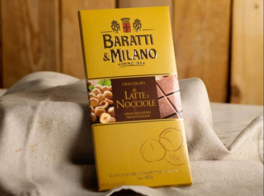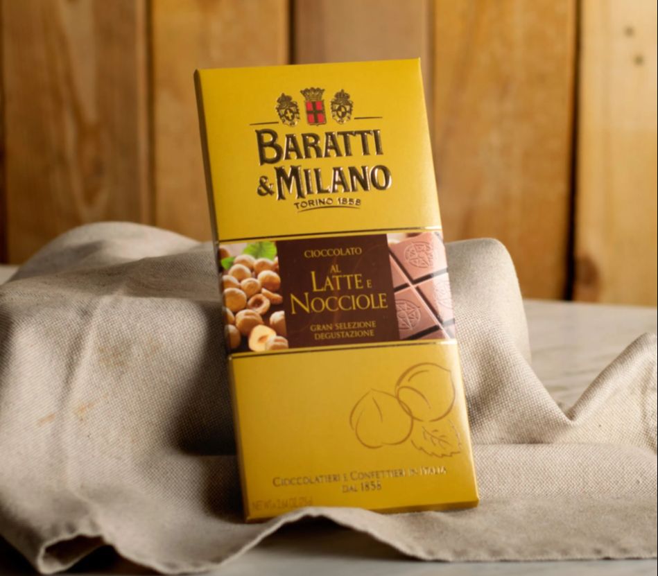 Opis proizvoda: Pločica mliječne čokolade i lješnjaka od 75g, umotana u aluminijsku foliju i u vanjskoj kartonskoj kutiji Brand: Baratti & Milano