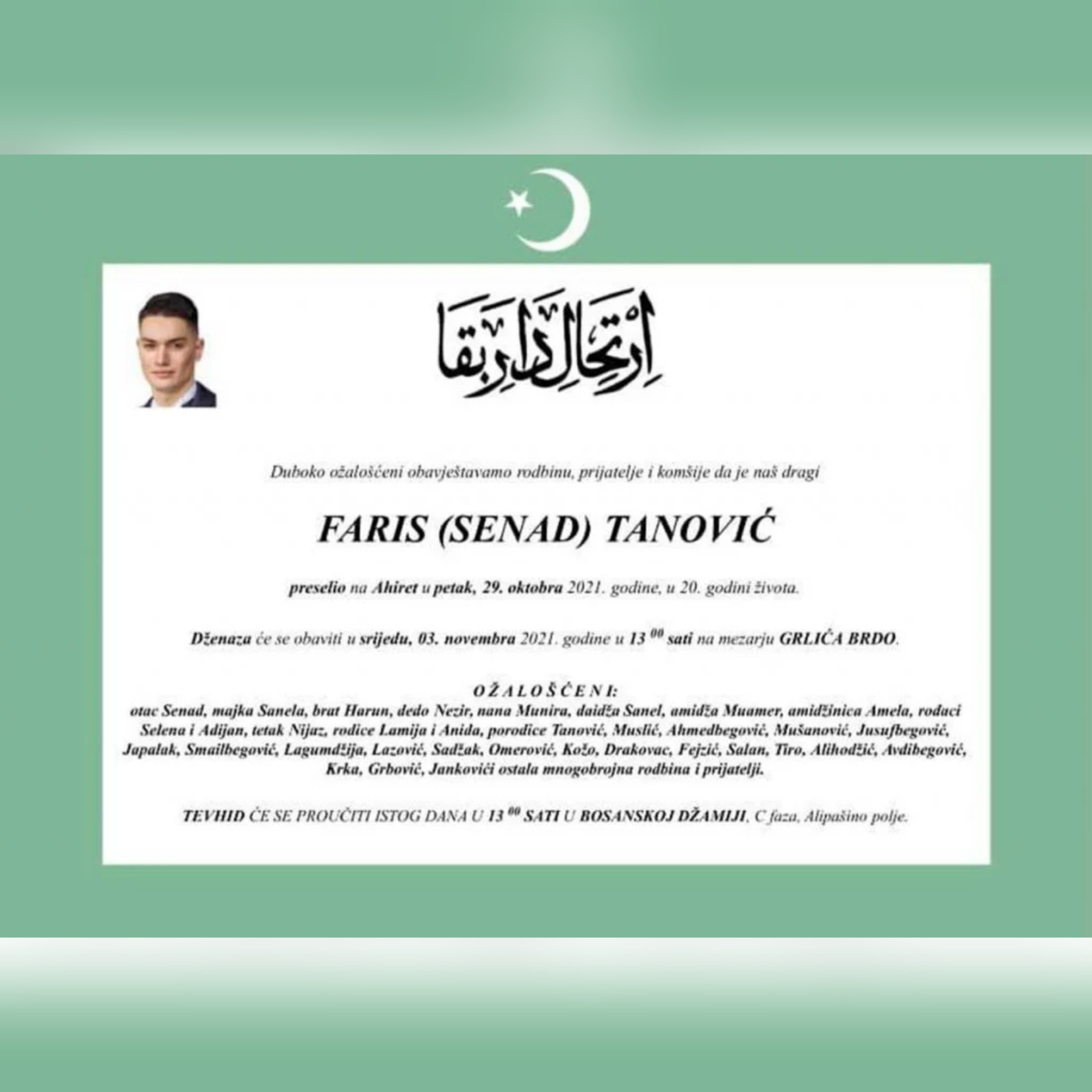 Sutra će na vječni počinak biti ispraćen tragično stradali mladić Faris Tanović. Dženaza 19-godišnjaku klanjat će se sutra u 13 sati na mezarju Grlića brdo, a u isto vrijeme će se klanjati tevhid u Bosanskoj džamiji na Alipašinom polju.