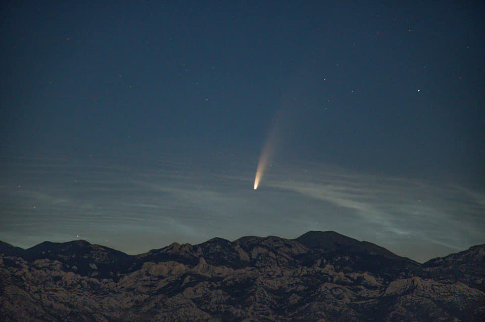 "Komet C/2020 F3 Neowise je već nekoliko dana vidljiv iz naših krajeva i sama sam ga do sada 2 puta fotografirala. Kako se u jučerašnjem danu izmijenila kiša pa bura htjela sam iskoristiti takve atmosferske uvjete da ga pokušam bolje dokumentirati. Velebit, planina koju obožavam, ovih dana do sada mi je ustvari zadavao glavobolju jer je nama iz Zadra u smjeru u kojem se i komet trenutno nalazi pa je to značilo da dobar dio vremena kad je komet vidljiv ne mogu iskoristiti. I to je upravo onaj bolji, tamniji dio noći“ , ispričala je Natalija Kosović za Indeks.