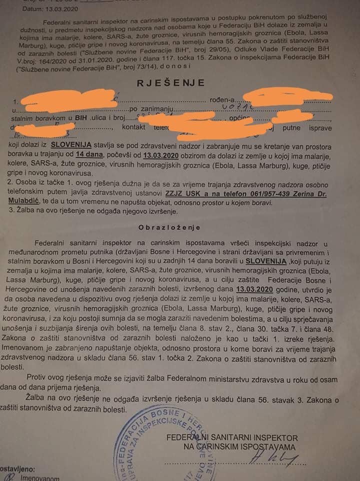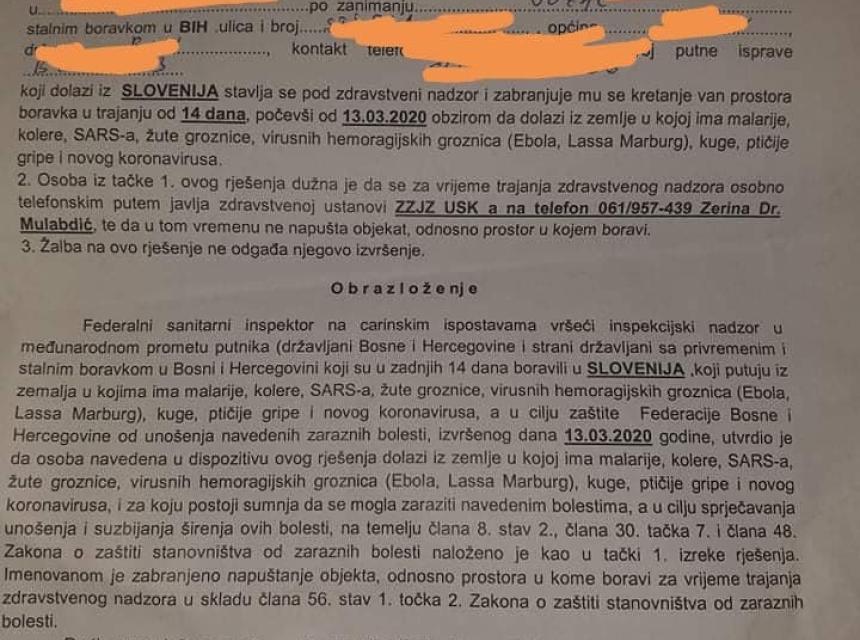 Počelo je upućivanje putnika koji ulaze u BiH iz Slovenije, Italije i drugih zemalja u kojima je koronavirus prisutan i u porastu. Rješenje je izdao sinoć sanitarni inspektor FBiH na GP Izačić. Ono podrazumijeva 14 dana samoizolacije i zato se preporučuje svima koji planiraju dolazak u BiH da sačekaju neko vrijeme na dolazak i ne riskiraju duži ostanak i eventualne probleme sa poslodavcima zbog posla.