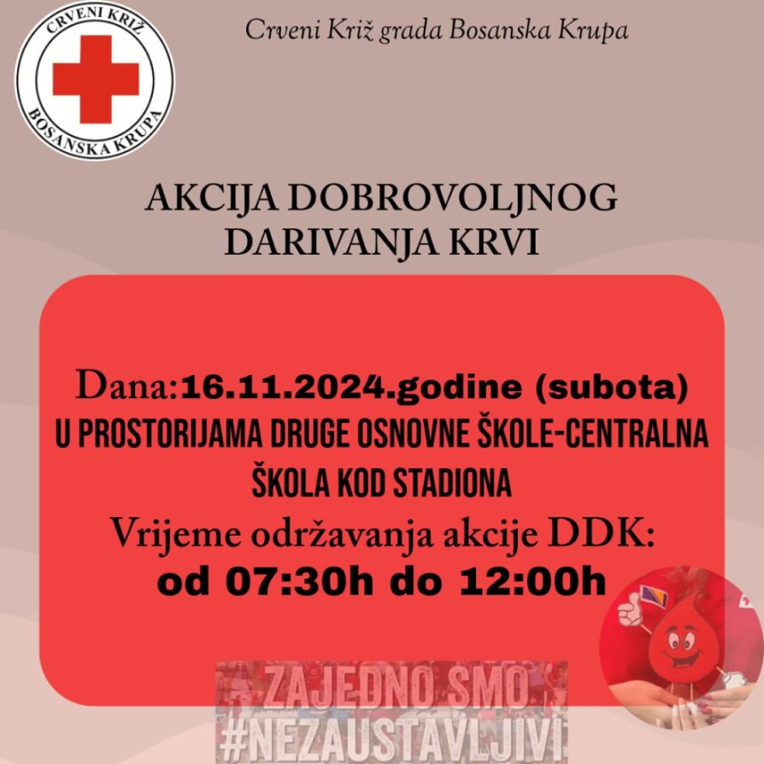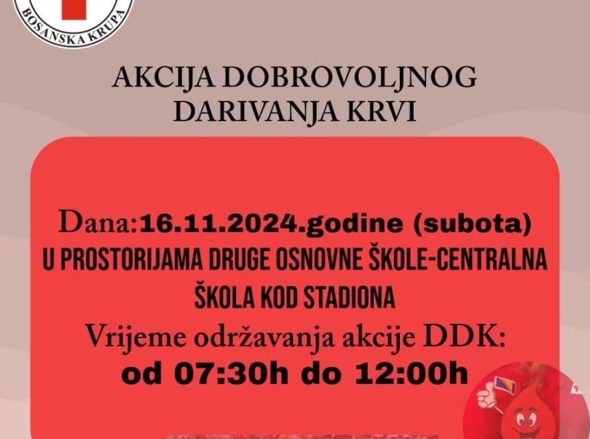 Dragi darivaoci, ovim putem Vas obavještavamo da će se Akcija dobrovoljnog darivanja krvi održati u subotu ,16.novembra 2024.godine u prostorijama Druge Osnovne škole Bosanska Krupa- Centralna škola kod stadiona.