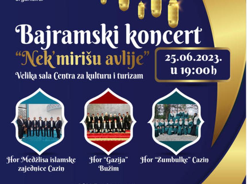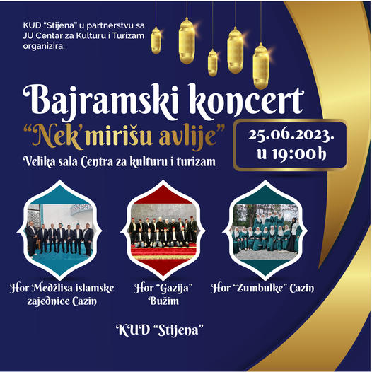 Kao uvod u obilježavanje bajramskih praznika, kulturno – umjetničko društvo Stijena u partnerstvu sa Centrom za kulturu i turizam Cazin organizuje koncert pod nazivom “Nek¨ mirišu avlije”.