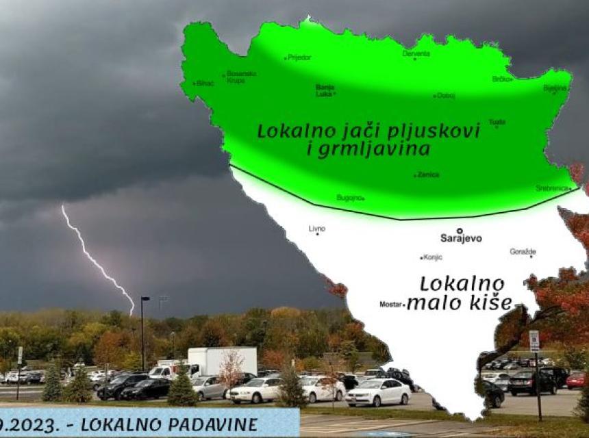 Očekuje se pojava lokalno jačih pljuskova i grmljavine, a rijetko će biti moguće manje nevrijeme. U večernjim satima očekuje se smirivanje vremena i prestanak padavina sa djelomičnim razvedravanjem, pri čemu će južni dio zemlje već od poslijepodneva biti bez padavina.