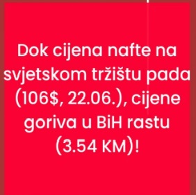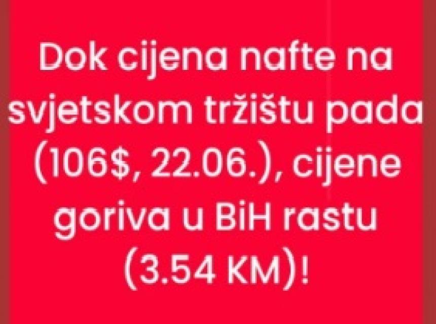 'Dok cijena nafte na svjetskom tržištu pada (106 američkih dolara 22. juna), cijene u BiH rastu 3,54 KM)', kako je rečeno u objavi koja je za sad imala veliki broj pregleda i dijeljenja putem ove društvene mreže.