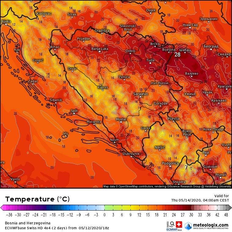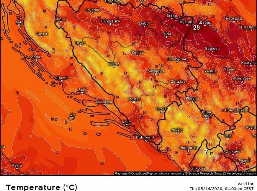 Vrlo vjerovatno je da ćemo zbog južnog vjetra imati i neuobičajeno visoke jutarnje temperature zraka za maj mjesec, koje će se u mnogim krajevima sutra ujutro kretati od 17 do čak 24 ili 25 °C. Pojedini visokorezolucijski modeli podižu te vrijednosti na području Semberije i na više vrijednosti od 25 °C za sutrašnji termin u 07:00.