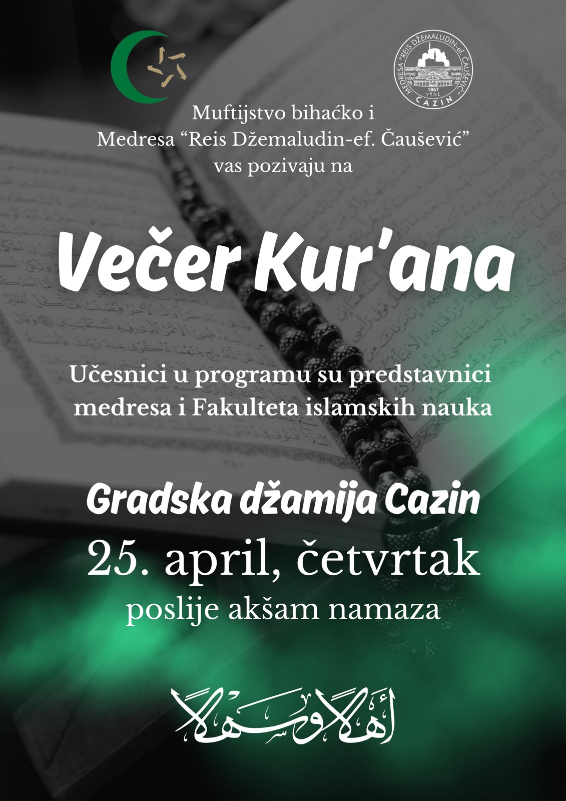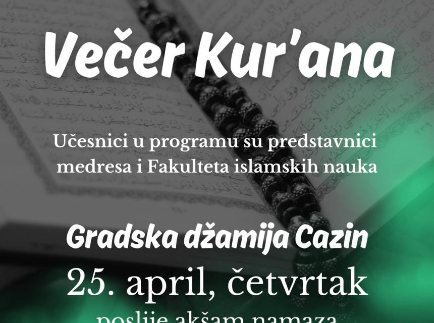 Večer Kur'ana održat će se u četvrtak, 25. aprila, poslije akšam-namaza u Gradskoj džamiji Cazin