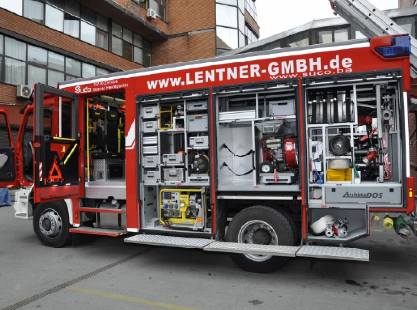 Vatrogasno vozilo napravljeno po najmodernijim evropskim standardima, a za koje se dijelovi izrađuju u Živinicama u firmi Sućo, predstavljeno je danas na platou ispred zgrade Općine Stari Grad u Sarajevu.