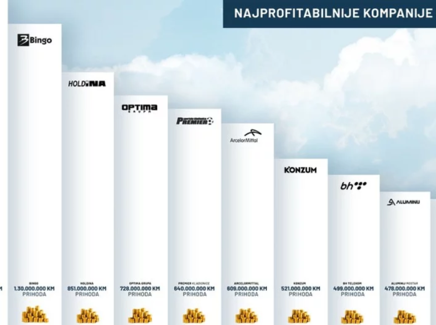 Kada je riječ o ukupnoj dobiti, bez konkurencije je na samom vrhu kompanija Bingo sa dobiti od 72 miliona KM. Na drugom mjestu su Autoceste FBiH s dobiti od 65 miliona KM te Fabrika duhana Sarajevo s dobiti od 64 miliona KM. Na četvrtom i petom mjestu su BH Telecom s dobiti od 60,07 i Telekom Srpske od 60 miliona KM.