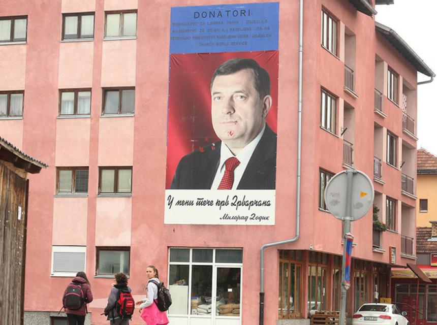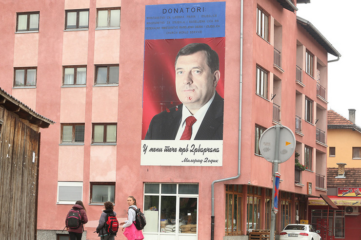 Zanimljivo je da je portret aktuelnog predsjedavajućeg Predsjedništva BiH ukrašen porukom, ispisanom na ćirilici: “U meni teče krv Drvarčana”.