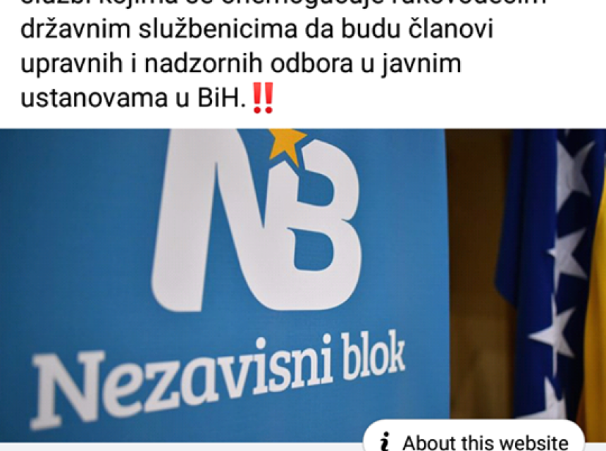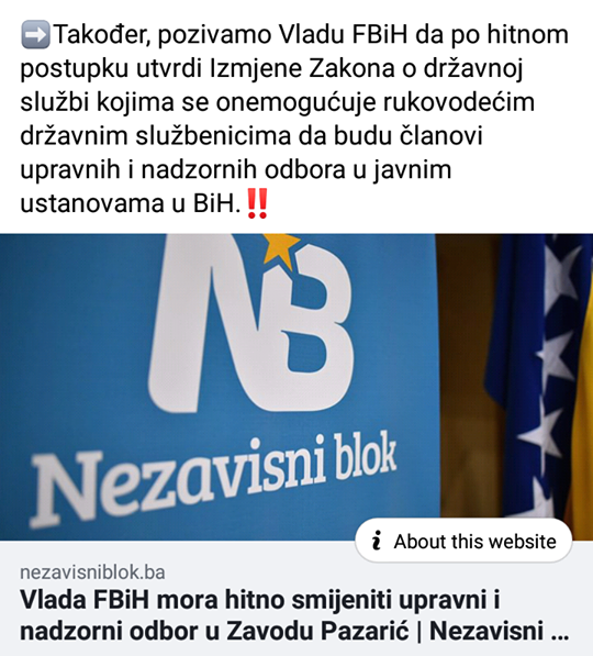 Također, pozivamo Vladu FBiH da po hitnom postupku utvrdi Izmjene Zakona o državnoj službi kojima se onemogućuje rukovodećim državnim službenicima da budu članovi upravnih i nadzornih odbora u javnim ustanovama u BiH.