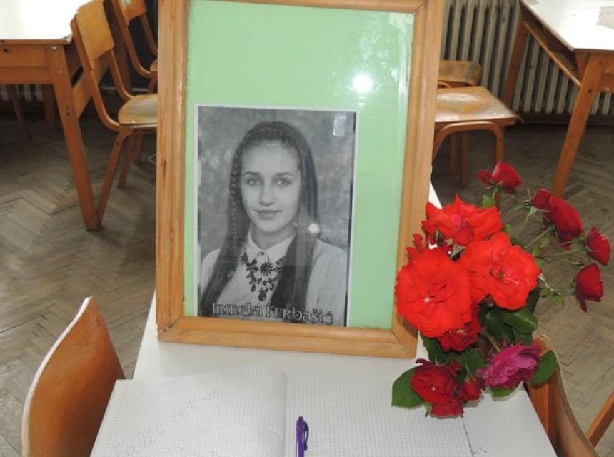 U učionici IX-1 razreda u trećoj klupi, umjesto uvijek vesele i nasmijane Irmele, bili su njena fotografija, cvijeće i knjiga žalosti.