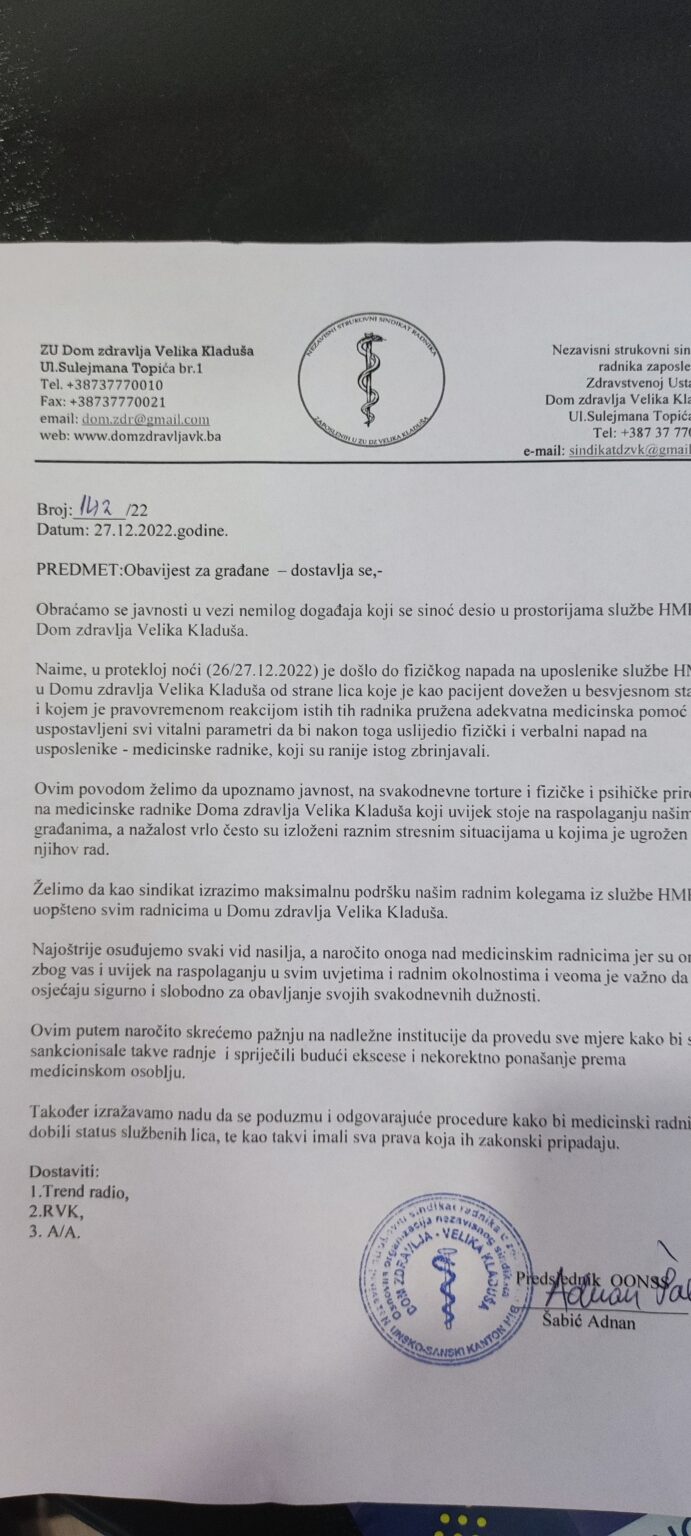 Sinoć se u hitnoj pomoći velikokladuškog Doma zdravlja desio incident. Naime pacijent je sinoć u službu hitne pomoći dovezen u besvjesnom stanju, a nakon ukazane pomoći i uspostavljanjem vitalnih parametara, pacijent je fizički napao zaposlene medicinske radnike, koji su ranije istog medicinski zbrinuli, piše Trend.